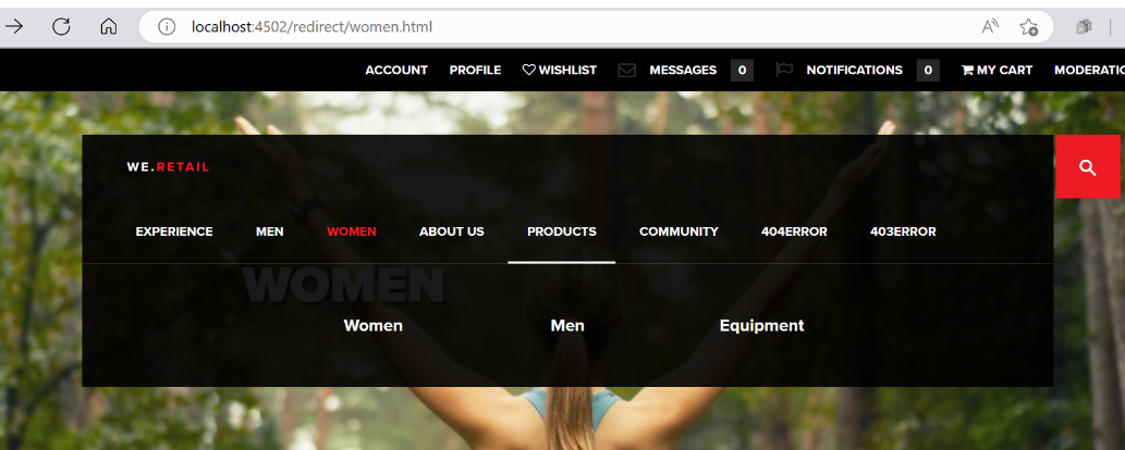 localhost:4502/redirect/women.htmlというリクエストを送ると、localhost_anyノードの設定通りlocalhost:4502/content/we-retail/us/en/women.htmlページを取得できます。